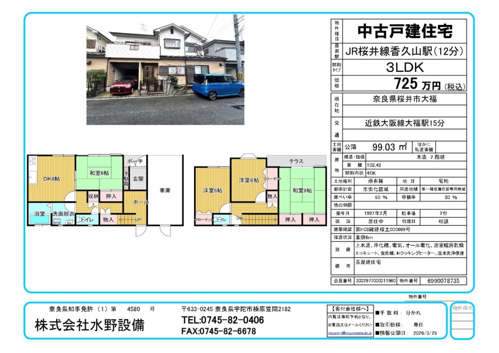 【売物件725万円】桜井市大福東向99.03㎡(築29年木造2階建108.48㎡)のご紹介です。
